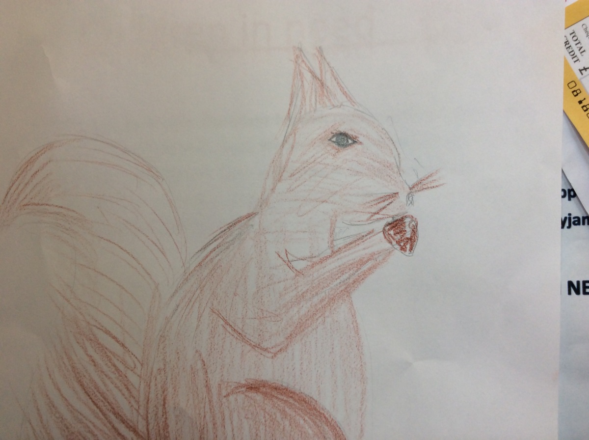 He is a beautiful ruby red, with shades of orange in his fur. The way Steve cracks his nuts is very unique. His paws are as silky as a moths best silk. He likes drinking fizzy pop! Eating popcorn and watching TV and when he is not watching TV he will be playing baseball (on the wii) !!!!
